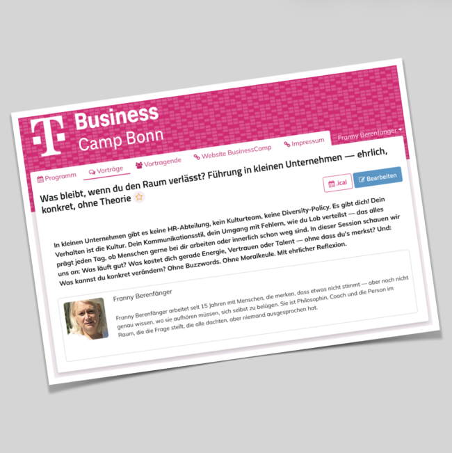 Am 26. März 2026 startet auf dem Telekom Campus Bonn das nächste Business­Camp, „ein themenspezifisches Barcamp, das sich explizit an Existenzgründer*innen