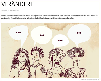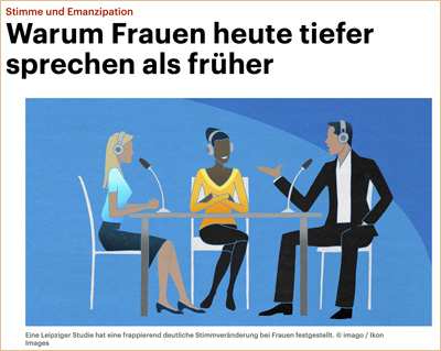 „Deutsche Frauen sprechen heute deutlich tiefer als vor 20 Jahren. Das hat eine Messung bei 2 472 Leipziger Bürgern ergeben. Männer sprechen normalerweise durchschnittlich auf einer Frequenz von 110 Hertz, bei Frauen sind es heute 168 Hertz, früher 220. Damit liegt die Frauenstimme jetzt nur noch eine Quinte über der Männerstimme – früher war es eine ganze Oktave. (…) der Zeitgeist hat sich in der Stimme niedergeschlagen. Früher waren hohe Frauenstimmen schick – denken Sie etwa an Doris Day. Es gab viele piepsige, mädchenhafte, süße Stimmen, die nach Schutzbedürfnis klangen. Die heutige Frau steht voll im Leben. Sie muss nicht mehr beschützt werden. Deshalb klingt sie auch anders.“ (Quelle)