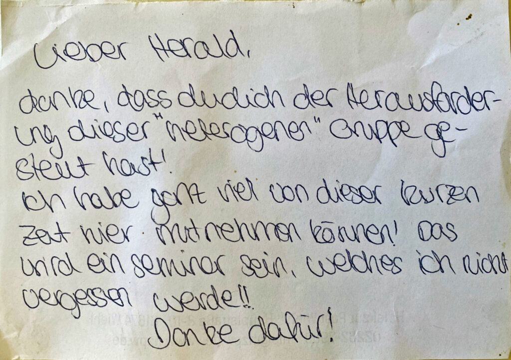 “Die zurückhaltende, aber auch klare und verbindliche Art, Deine Beobachtungen mit uns zu teilen, macht es leicht diese aufzunehmen und zu akzeptieren.”